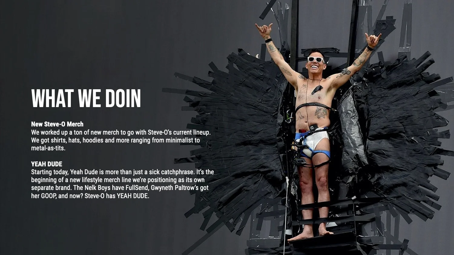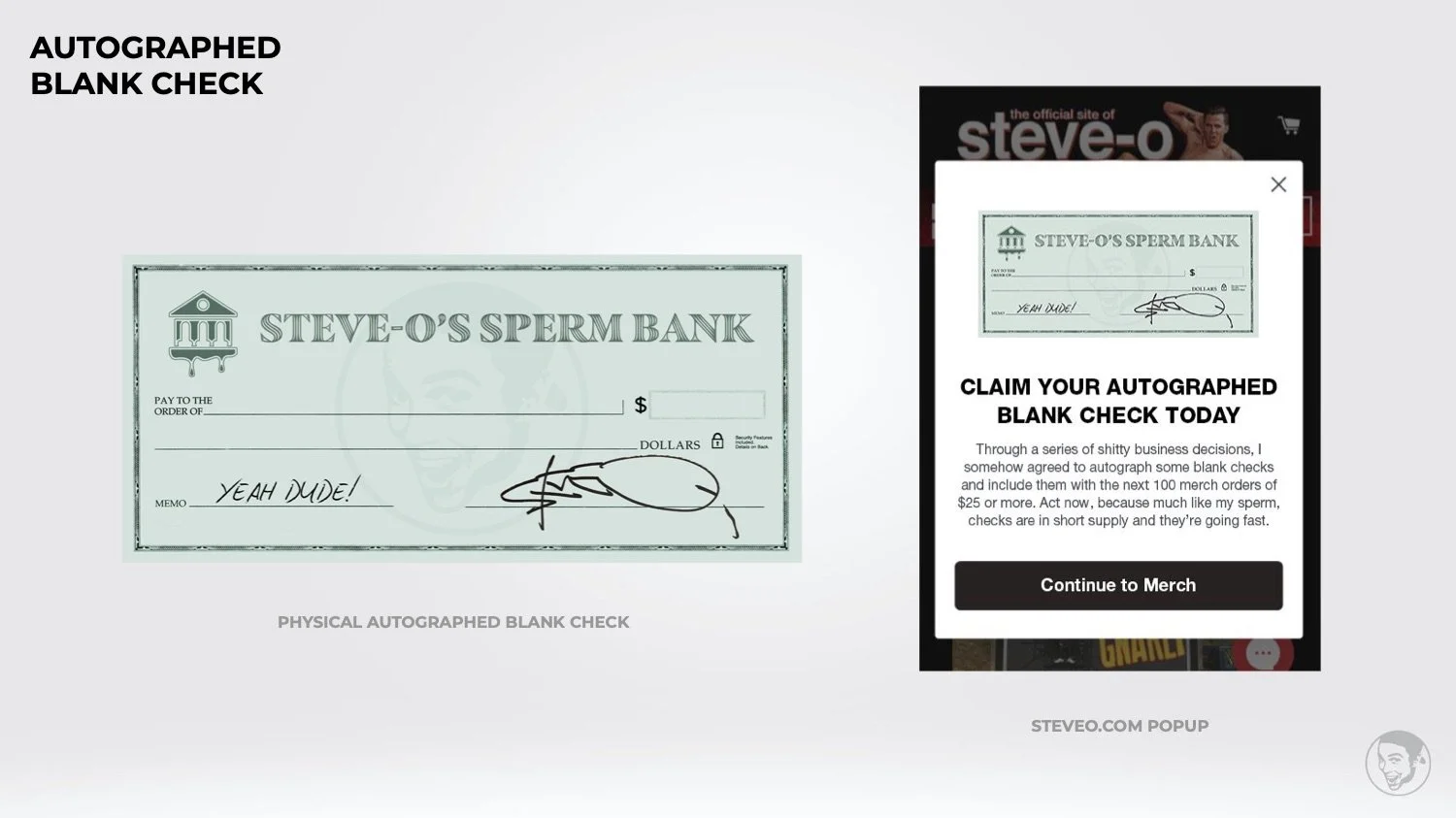 Years ago, Steve-O re-emerged into the public eye as a youtube-podcaster with his very own merch store. A merch store that needed some serious beefing up. So me and some buds got together and pitched the following.